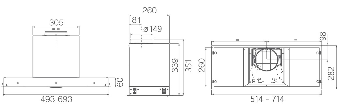 Вытяжка работает в режимах отвода и циркуляции, поэтому загрязнения удаляются из комнаты и перенаправляются в воздуховод, при этом можно очистить воздух и использовать повторно за счет возвращения его в помещение. Количество скоростей в этой модели: 3 шт. При этом максимальная производительность составляет 640 куб.м./ч. Уровень шума при полной загруженности — 57 дБ.